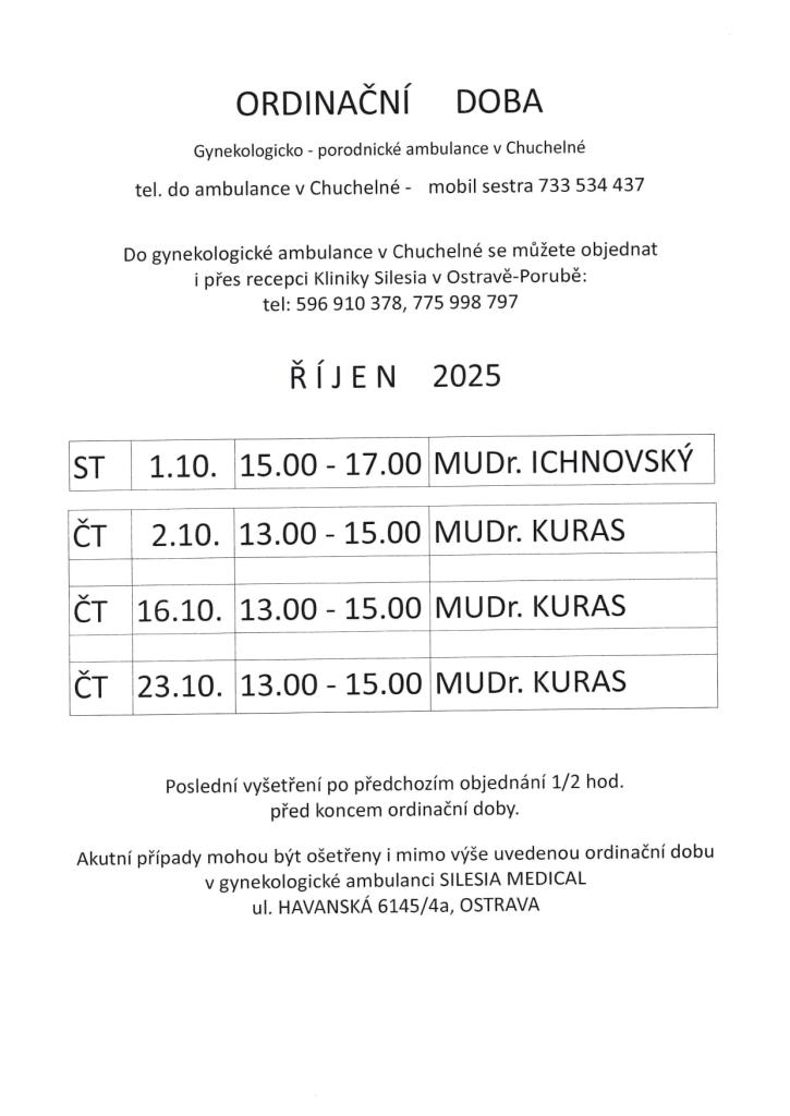 Gynekologicko - porodnická ambulance Chuchelná - ordinační doba říjen 2025