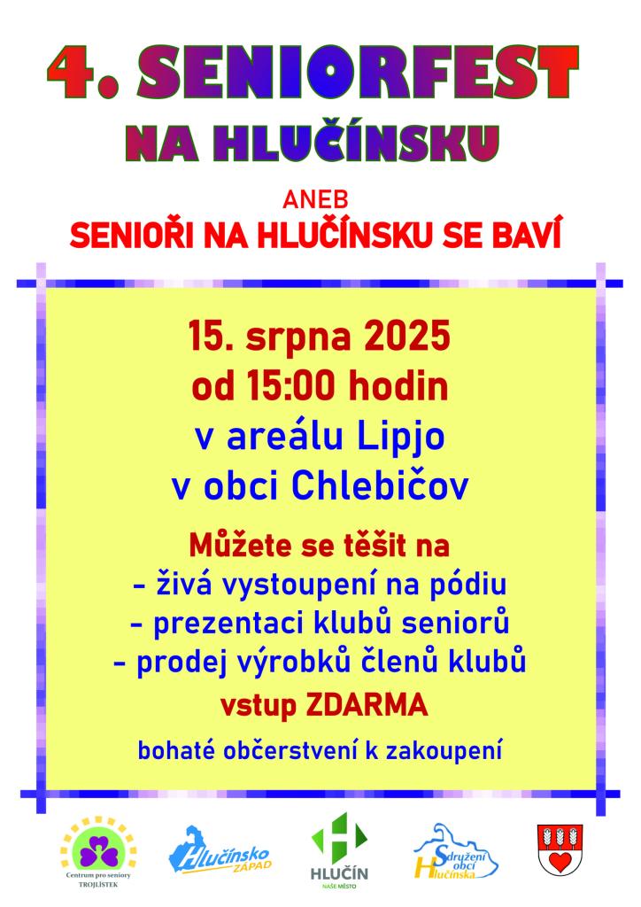 4. Seniorfest na Hlučínsku aneb Senioři na Hlučínsku se baví. Akce proběhne 15.8.2025 od 15:00 hodin v areálu Lipjo v obci Chlebičov. Vstup zdarma.