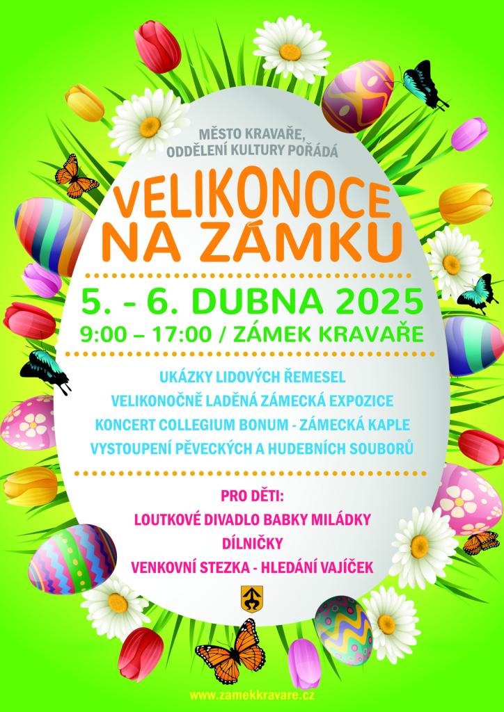Město Kravaře pořádá Velikonoce na zámku 5. - 6. dubna vždy od 9:00 do 17:00. Přijďte se svými dětmi na loutkové divadlo Babky Miládky, zúčastněte se kreativních dílniček a užijte si venkovní stezku s hledáním vajíček.